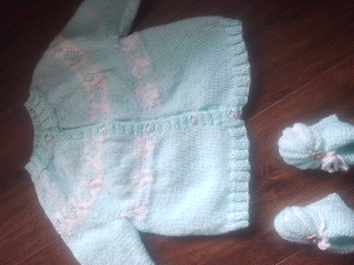 Ook deze creatie is weer voor ons aanstaand kleinkind. Voorlopig zien jullie niets anders hoor. Wat vinden jullie van de slofjes. Dat is een patroon van 1947.